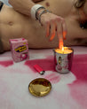 the candle’s genderless scent is designed to take you somewhere else — to a sweaty, nostalgic bubblegum beach where culture meets body care.